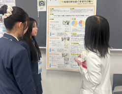 10月25日(土)オープンスクールを実施し、県内外の中学生262名が参加しました。今年度は時期をずらして、2年生普通科の探究学習発表会と同時開催。学校長より本校の特色について説明の後、2年普通科の2チームが代表発表をおこないました。一つ目は多世代交流について実践してきたチーム。