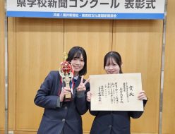 第60回福井県学校新聞コンクールで、本校新聞部が6年連続となる最優秀賞を受賞しました。12月5日(金)には福井新聞社で表彰式が行われ、前新聞部部長の大野さんと前副部長の上野さんが参加しました。