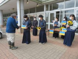 美方高校剣道部員がロシアのウクライナ侵攻による難民支援のため4月16日に美方ショッピングセンターレピア、18日にゲンキー梅街道店で募金活動をしました。募金に協力していただいた方には、生徒が作ったウクライナ国花のひまわりの折り紙や造花を手渡しました。