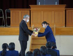 今年度でご退職となる木本健校長先生の退任式が行われました。教頭先生のご紹介の後、校長先生よりお別れの言葉をいただきました。校長先生は、「どうせやるなら喜んで」という言葉をモットーにされていることや何事も前向きに自分の目標に向かって頑張っていってほしいと話されました。