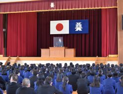 いよいよ令和4年度が始まり、新任式、始業式、対面式が行われました。まず最初に新任式を終えて、生徒も3学年、教職員も全員揃い、令和4年度の始業式を行いました。