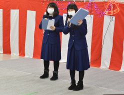 伝達表彰と2学期の終業式が体育館で行われました。伝達表彰では2学期中に部活動の大会で活躍した部員や県及び校内読書感想文コンクール入賞者が表彰されました。その後の終業式では、校長式辞、指導部長訓話がありました。