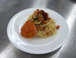 12月8日、食物科1年生が県の農林水産部主催の「越前ガニの料理法を学ぶ」講習を受けました。小浜魚商協同組合の野村理事長が講師として、越前港で水揚げされたセイコガニを使って、ゆで方やむき方、オイルパスタの作り方を説明してくださいました。