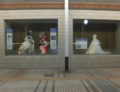 敦賀信用金庫本店様のショーウィンドウに生活情報科の作品を展示させていただきました。作品は、デザインコンクール作品における入賞作品と生徒がデザインしてプロの方に製作していただいたウェディングドレスの3点を飾りました。