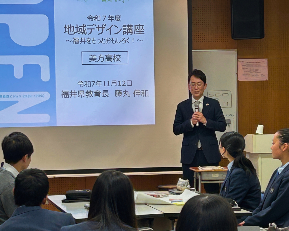 福井県藤丸教育長が来校され、1-R対象に「地域デザイン講座」をして頂きました。