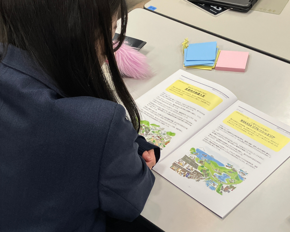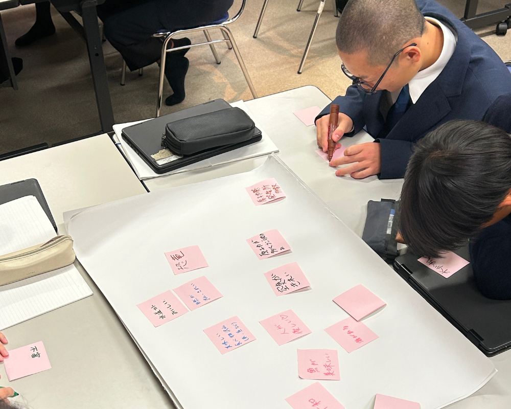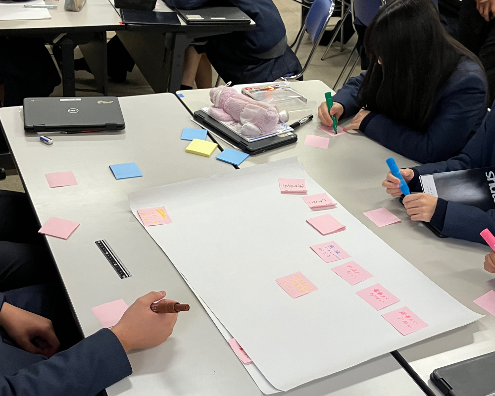 生徒達はテーマについて積極的に話し合い、アイディアを付箋と模造紙にまとめていました。