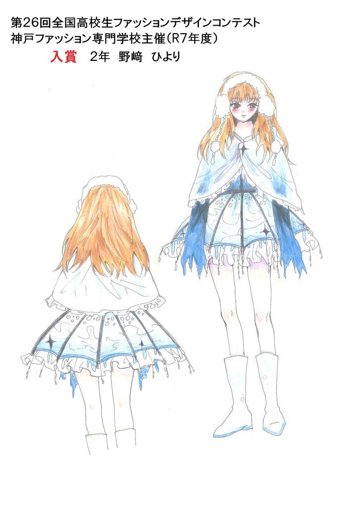 1月31日(土)、神戸朝日ホールにて「第26回全国高校生ファッションデザインコンテスト」が開催され、生活情報科2年の野﨑ひよりさんの作品が入賞しました。