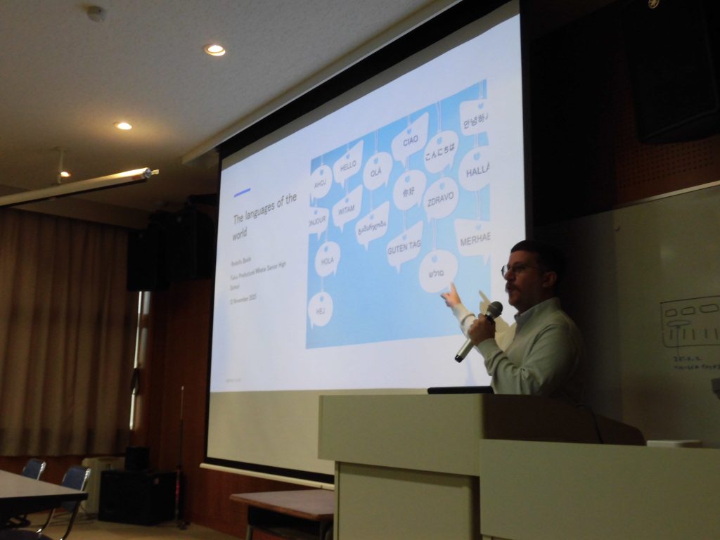 京都大学からイタリア語出身の Rodolfo BASILE (ロドルフォ・バージレ)先生をお招きし、ロドルフォ先生のご専門のフォンランド語の会話を始め、世界の多様な言語文化について学びました。